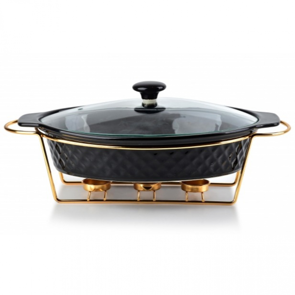 Šis įstabaus grožio stalo indas labai papuoš Jūsų šventinį stalą! Pagamintas iš itin aukštos kokybės keramikos – galima naudoti orkaitėje iki 180°C, galima plauti indaplovėje. Marmitas įstatytas į aukso spalvos rėmelį, kuriame žvakutės palaiko šilumą per visą šventinę vakarienę.
